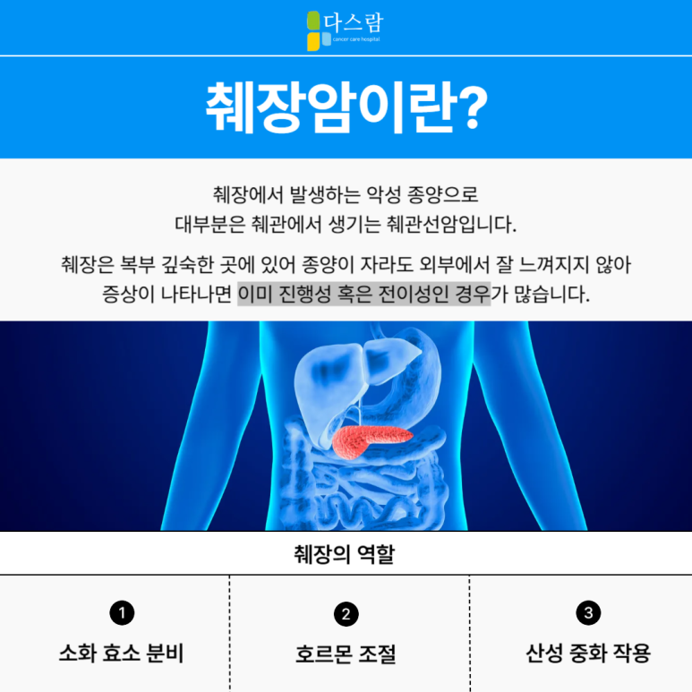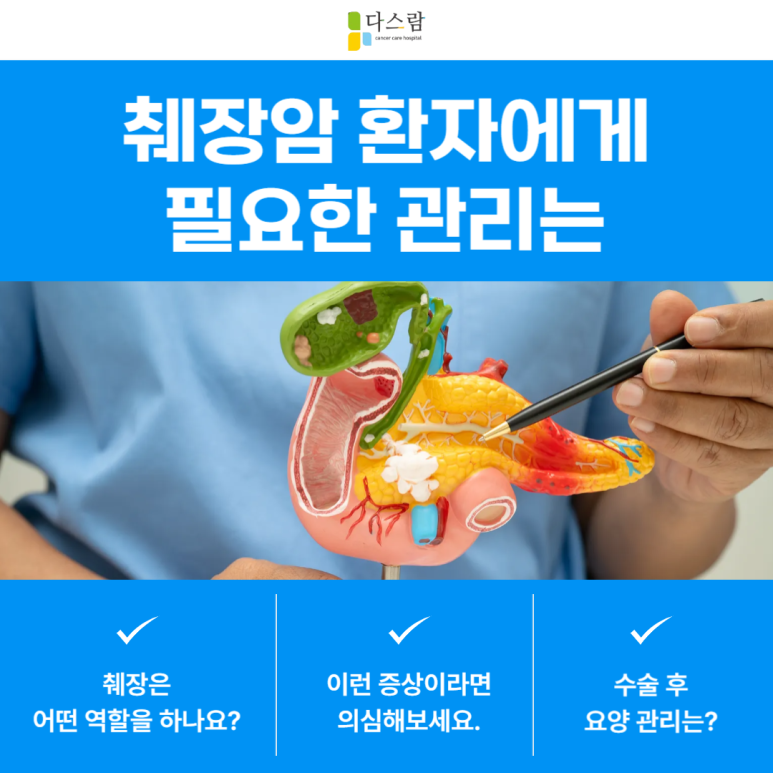 오늘은 일산암요양병원 다스람요양병원에서 췌장이 어떤 역할을 하는 장기인지, 췌장암의 증상과 예방법, 수술 후 회복을 위한 요양 관리에 대해 차근차근 알려드리겠습니다.