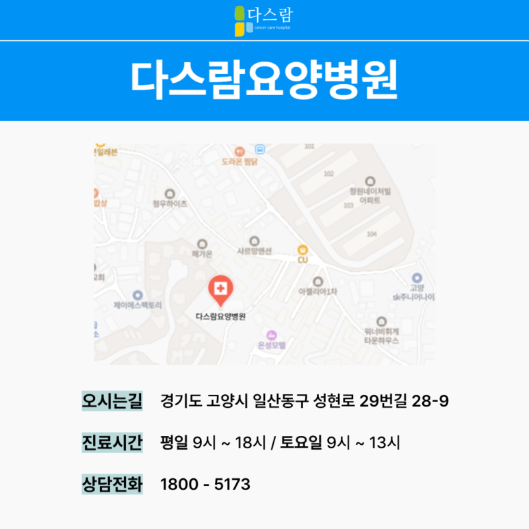 췌장암은 수술 이후가 더 중요합니다. 몸과 마음이 회복되는 과정에서 누구와 함께 하는지가 회복 속도와 삶의 질을 결정 짓습니다. 일산암요양병원 다스람요양병원은 췌장암 환자와 가족이 조금 더 편안하게, 그리고 희망을 가지고 회복할 수 있도록 곁에서 돕고 있습니다.