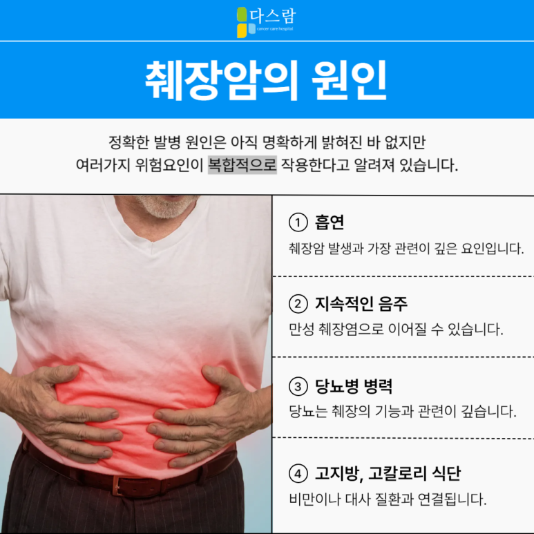- 가족력 : 유전적으로 췌장암 병력이 있는 경우 더 주의해야 합니다.