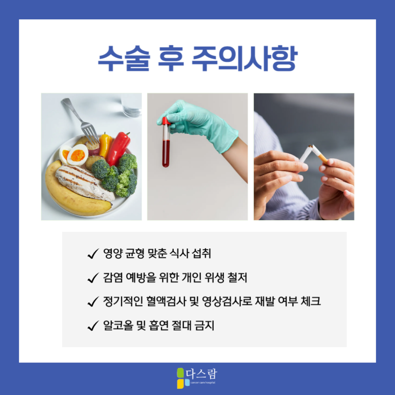 특히 수술 후 면역력이 약해진 상태에서는 쾌적하고 안정적인 환경에서의 회복이 중요하기 때문에국립암센터요양병원 중 다스람요양병원을 이용하는 것이 큰 도움이 될 수 있습니다.
