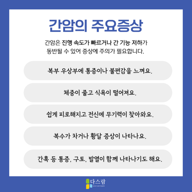 이러한 증상이 나타난다면 반드시 의료진 진료를 받아야 하며, 국립암센터요양병원 근처에서 치료 후 회복을 고려하신다면 다스람요양병원을 함께 알아보세요.
