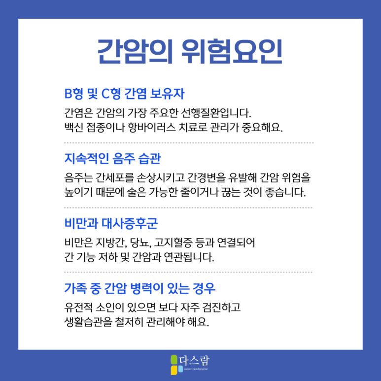 간염은 간암의 가장 주요한 선행질환입니다. 백신 접종이나 항바이러스 치료로 관리가 중요해요.