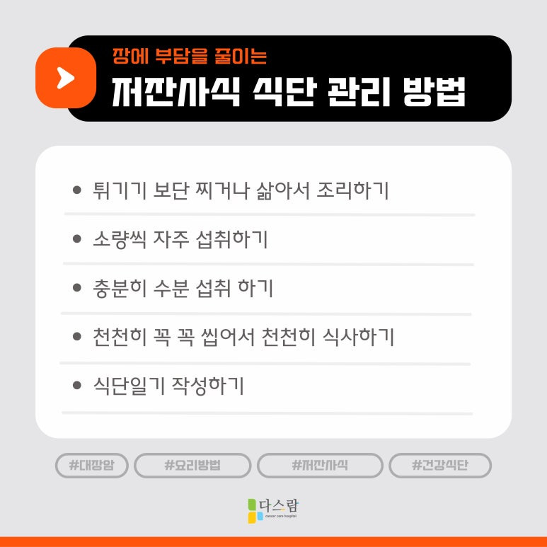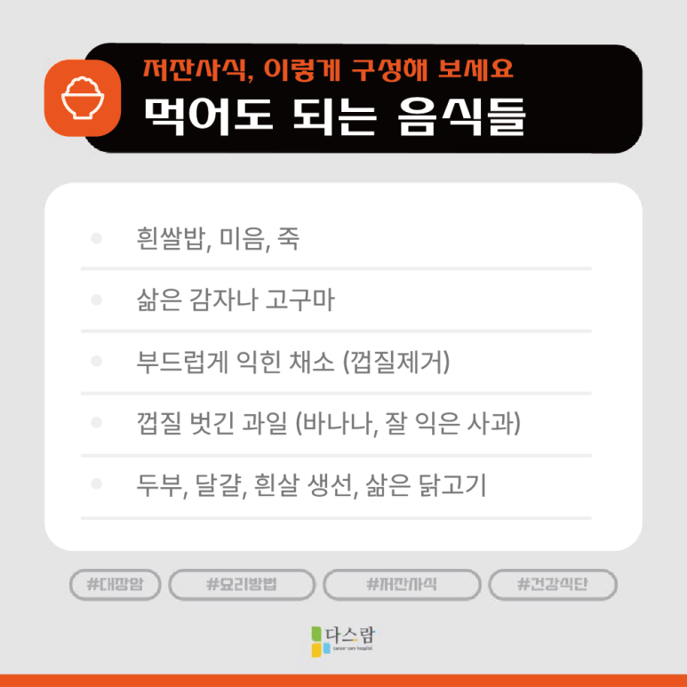 대장암 수술 후나 항암치료 중에는 장이 예민하고 약해진 상태예요. 이때 무거운 음식이나 자극적인 음식은 장에 큰 부담을 주고, 회복을 방해할 수 있어요. 반면 저잔사식은 장을 편안하게 해주면서도 필요한 영양을 공급할 수 있어 회복 속도를 높이는 데 도움이 됩니다.