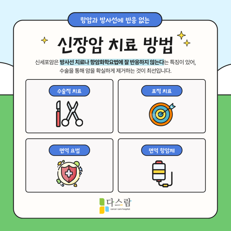 신세포암은 방사선 치료나 항암화학요법에 잘 반응하지 않는다는 특징이 있는데요. 따라서 수술을 통해 암을 확실하게 제거하는 것이 최선이라고 볼 수 있습니다.