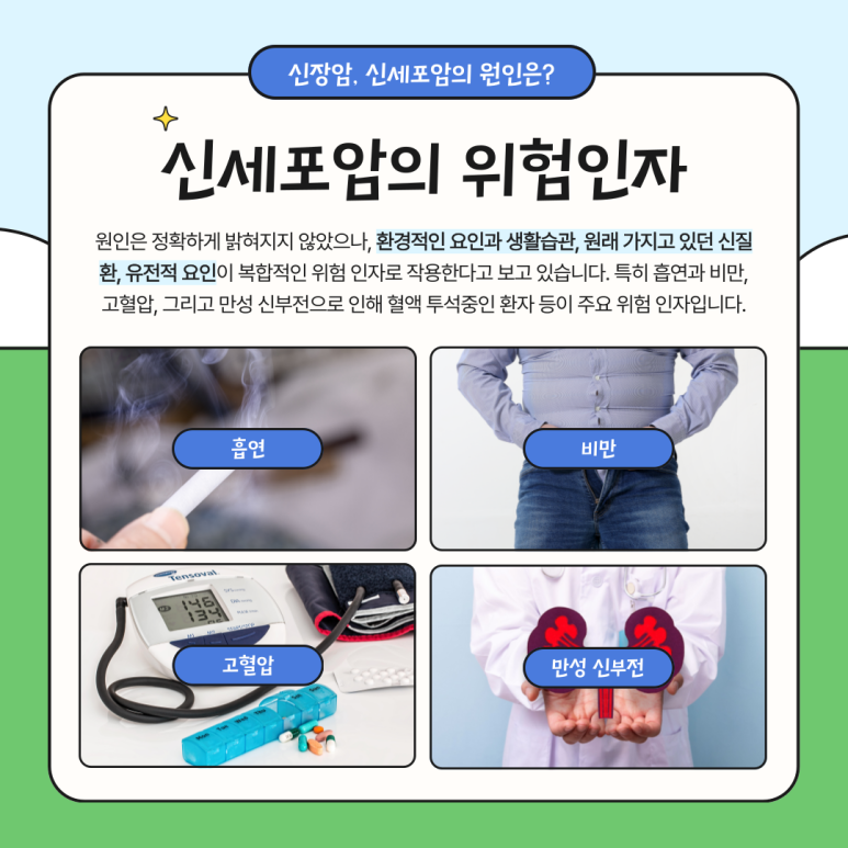 신장암, 신세포암의 발생 기전은 정확하게 밝혀지지 않았으나, 환경적인 요인과 생활습관, 원래 가지고 있던 신질환, 유전적 요인이 복합적인 위험 인자로 작용한다고 보고 있습니다.