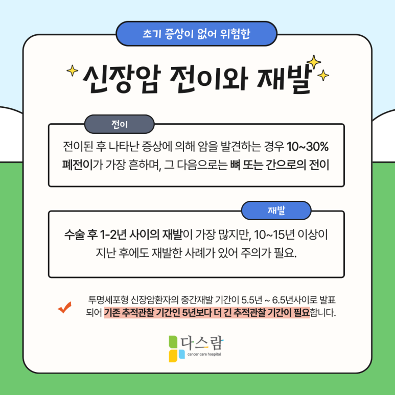 앞서 언급한 바와 같이 신세포암은 증상이 거의 없어 이미 전이가 진행되어, 이로 인해 발생하는 증상으로 암을 발견하는 경우가 10~30% 정도로 많은 편이며, 재발은 수술 후 1-2년 사이에 많이 발생하지만, 10~15년 이상이 지난 후에도 재발한 사례가 있기 때문에 수술 후에도 주기적인 추적 관찰이 꼭 필요합니다.