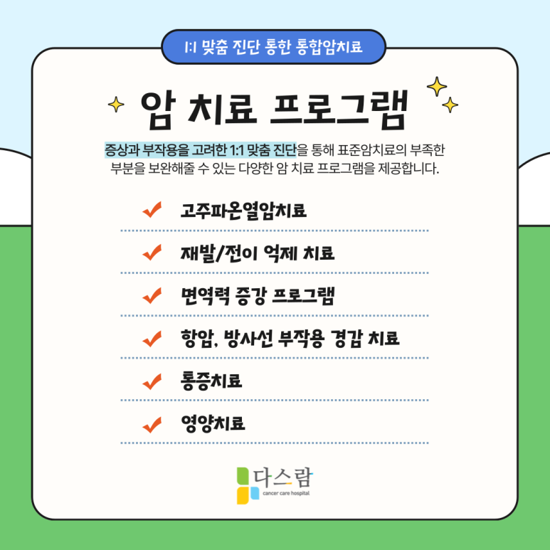 다스람요양병원에서는 신장암 환우 분들의 증상과 부작용을 고려한 1:1 맞춤 진단을 통해 표준암치료의 부족한 부분을 보완해줄 수 있는 다양한 암 치료 프로그램을 제공합니다.