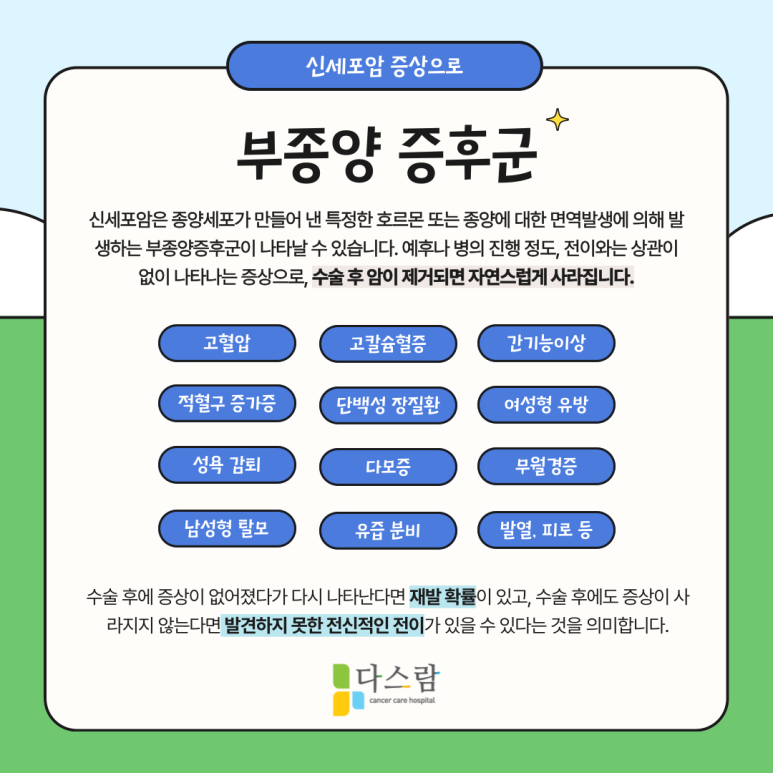 '부종양증후군'은 예후나 병의 진행 정도, 전이와는 상관이 없이 나타나는 증상으로, 수술을 통해 암을 제거하면 자연스럽게 사라지게 됩니다. 따라서 수술 후에 증상이 없어졌다가 다시 나타난다면 재발 확률이 있는 것이고, 수술 후에도 증상이 사라지지 않는다면 발견하지 못한 전신적인 전이가 있다는 것을 의미하게 되는 것이에요.