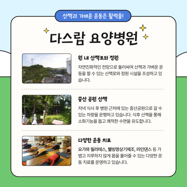 경기도암병원 다스람요양병원에는 산책로가 구성되어 있고, 자연친화적인 환경에 있어 언제든지 산책을 나갈 수 있어요. 그리고 저녁 식사 후에는 병원 근처에 있는 중산공원으로 갈 수 있는 차량을 운행하고 있어 가벼운 활동을 하기 좋은 곳에 위치했습니다.
