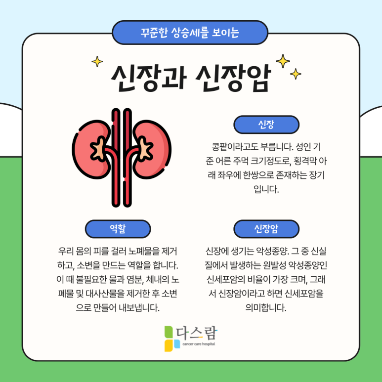 신장암은 알려져 있는 암 중에 많은 비율을 차지하고 있지는 않지만, 꾸준한 증가세를 보여 주의가 필요한 암 중 하나입니다.