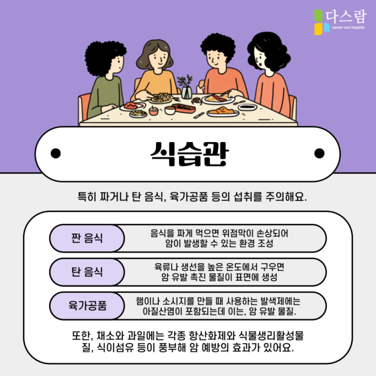 탄 음식, 지나치게 짠 음식, 햄이나 소시지 같은 가공육 섭취는 위암이나 대장암과 관련이 있어요.