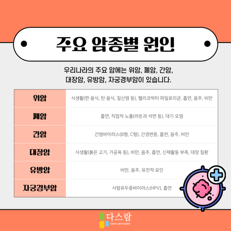 암 종류별로 어떤 요인들이 영향을 미치는지 간단히 정리해볼까요?