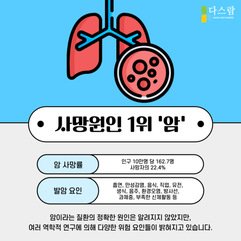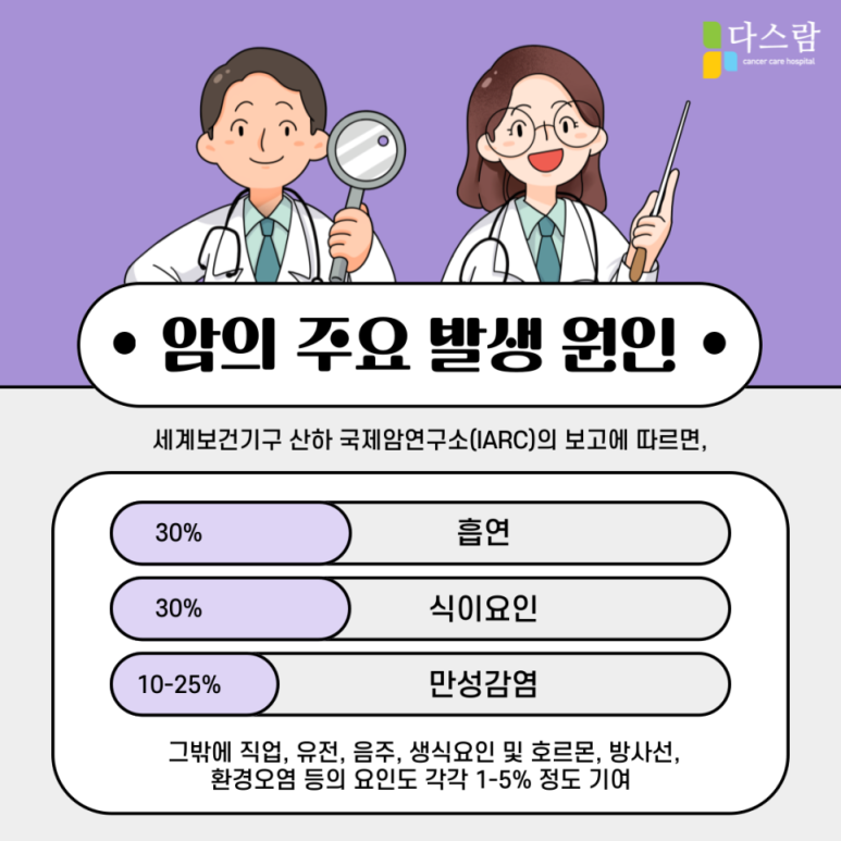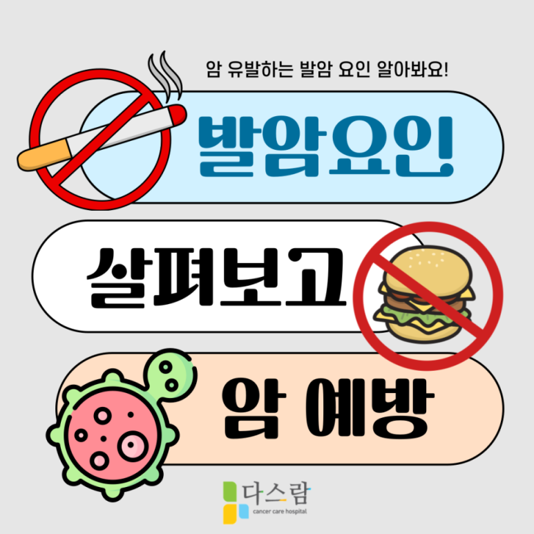 이번 글에서는 다스람요양병원과 함께, 암 생기는 이유와 평소 생활에서 어떤 점을 조심해야 하는지 살펴보도록 하겠습니다.
