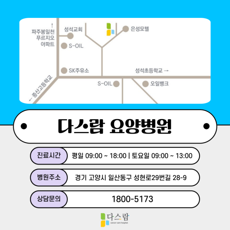 만약 지금 암 진단을 받았거나 치료 중에 있다면, 혼자 걱정하지 마시고 도움을 받아보시는 것도 좋습니다. 다스람요양병원은 여러분이 건강을 회복하는 길에 함께하고 있어요.
