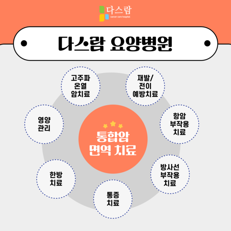 아무리 조심해도 암을 완전히 피할 수 없는 경우도 있습니다. 다스람요양병원에서는 치료 효과를 높이고, 환자의 부담은 줄일 수 있도록 다양한 방식의 통합 치료를 제공해 드리고 있습니다.