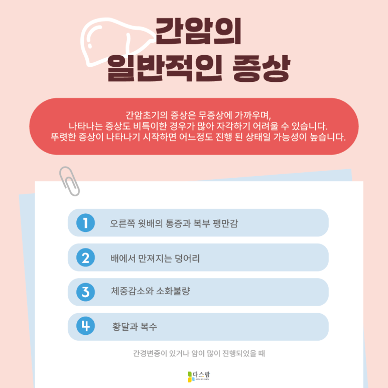 ‘침묵의 장기’라는 별명처럼 간은 기능에 문제가 생겨도 특별한 신호를 보내지 않는 경우가 많아요. 그래서 간암증상이 나타났을 때는 이미 간이 상당히 손상된 상태일 수 있답니다.