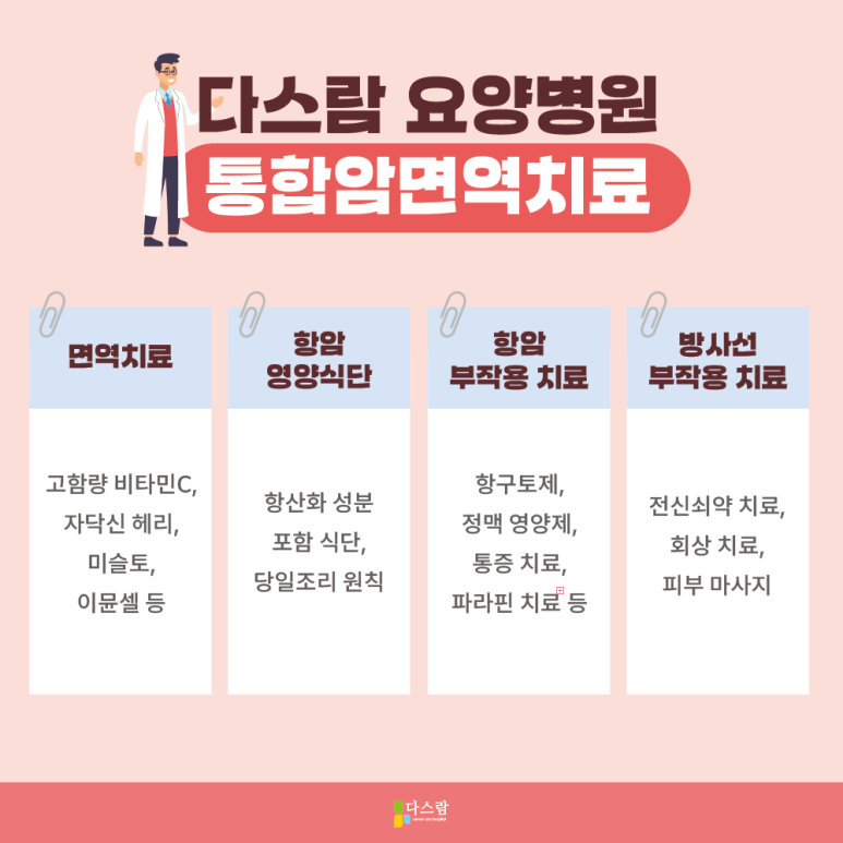 다스람요양병원에서는 간암 환우분들의 치료 이후 빠른 회복을 돕기 위해 다양한 접근을 시도하고 있어요. 통증이나 부작용을 완화하고, 체력과 면역력 회복에 초점을 맞춘 프로그램이 함께 진행되고 있답니다.