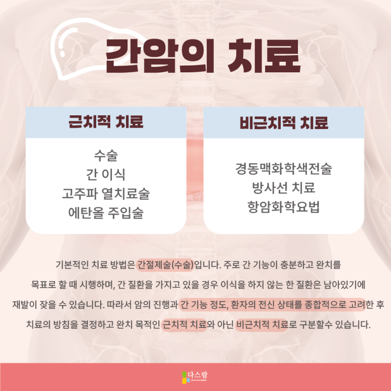 간 기능이 저하되었거나 병기가 많이 진행된 경우에는 통증 완화와 합병증 예방을 중심으로 치료를 진행해요. 경동맥화학색전술, 방사선, 항암화학요법 등이 이에 해당하죠.