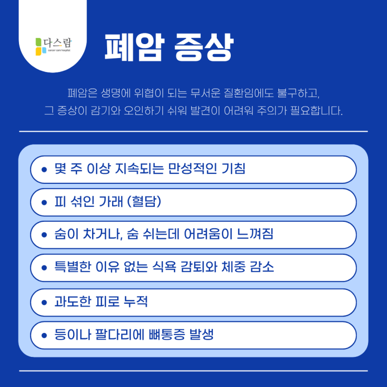 그런데, 치료 후 관리에 따라 예후가 크게 달라질 수 있다는 사실, 알고 계셨나요? 오늘은 일산암병원을 대표하는 저희 다스람요양병원과 함께 폐암 환우분들을 위한 치료와 회복을 위한 관리방법에 대해서도 자세히 알아보겠습니다.