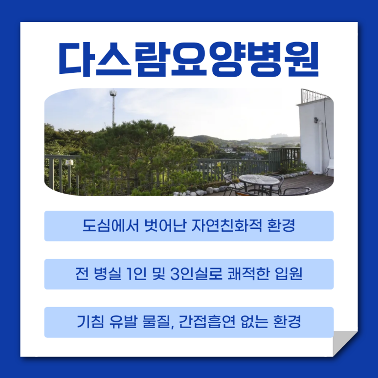 저희 다스람요양병원은 환자분들의 삶의 질 회복을 최우선으로 생각하며 최선을 다하고 있어요. 양방 치료만으로는 놓치기 쉬운 환자의 체력, 면역, 정신적인 부분을 한방 치료와 함께 보완하여 치료 효과를 높이기 위해 최선을 다하고 있죠.