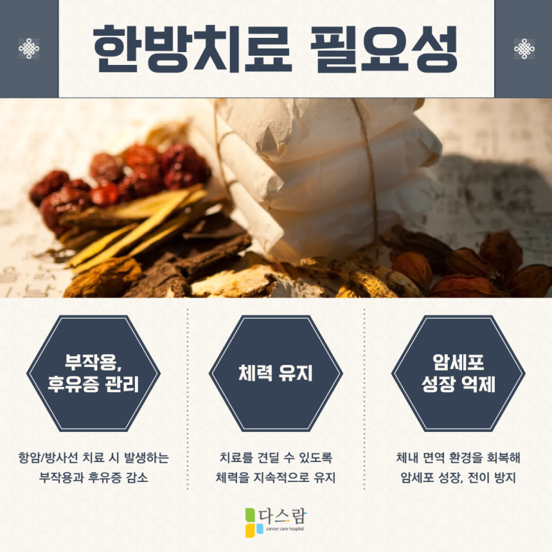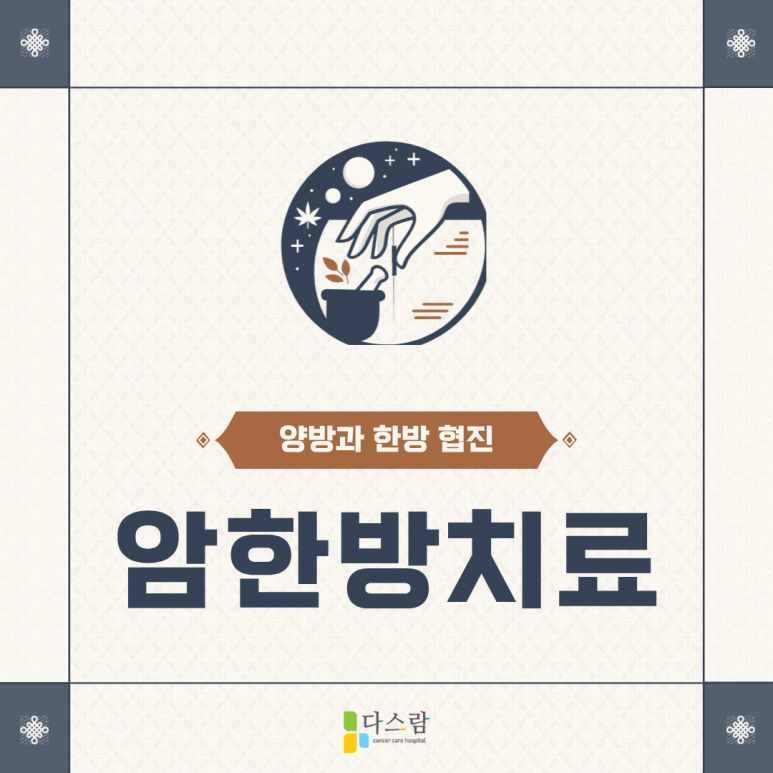 도봉구암요양병원을 대표하는 저희 다스람요양병원에서는 항암제나 방사선 치료로 인한 후유증을 한방의 약침치료, 한약 처방, 뜸 치료 등을 병행하여 보완하고 있습어요.