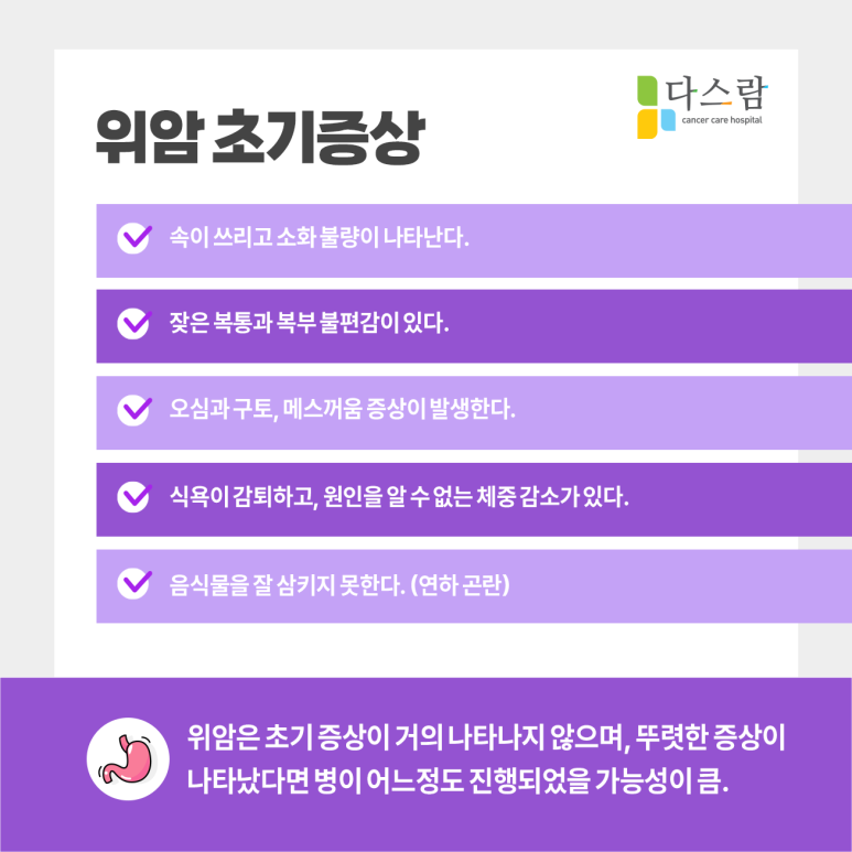 위암 치료는 위암 병기에 따라 수술, 항암제 치료, 방사선 치료 등이 병행되며, 환자분들의 삶의 질에 직접적인 영향을 미칠 수 있는데요, 은평구암요양병원을 대표하는 저희 다스람요양병원에서는 이러한 치료 과정에서 발생하는 다양한 부작용과 회복 문제를 체계적으로 관리하고 있습니다.