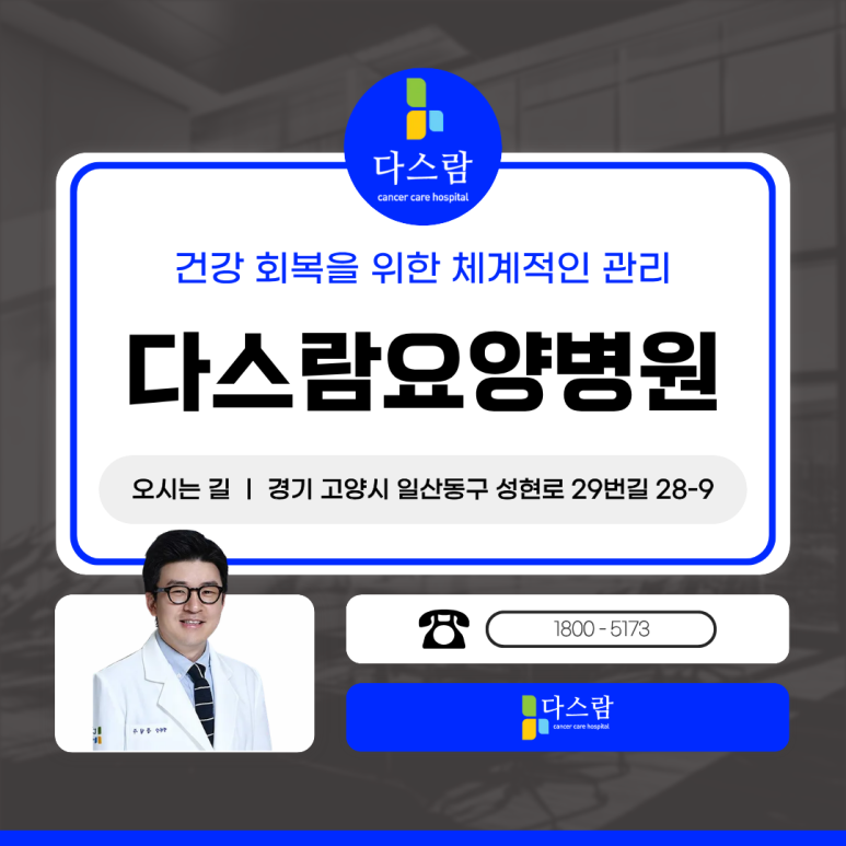 일산암요양병원을 대표하는 저희 다스람요양병원에서는 통증·영양·면역·정서까지 아우르는 통합 관리로 환자분들이 치료 이후에도 안정적으로 회복할 수 있도록 함께하고 있습니다. 추가적인 문의가 있으신 경우 내원하여 상담받아보시기 바랍니다.