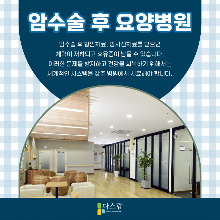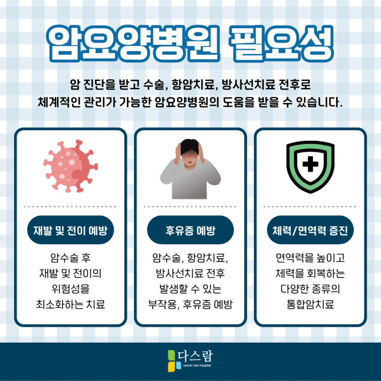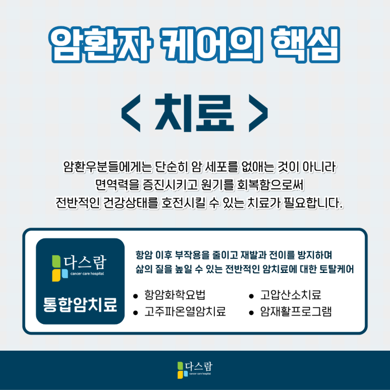 특히 암 환자는 항암치료 과정에서 면역력 저하·체력 소모·정신적 스트레스를 동시에 겪기 때문에, 이를 종합적으로 관리하는 다학제 접근이 필요한데요, 다스람요양병원은 한방·양방 협진을 기반으로 한 통합진료 시스템을 운영하여 환자의 신체적 회복은 물론 심리적 안정까지 세심하게 돌보고 있습니다.