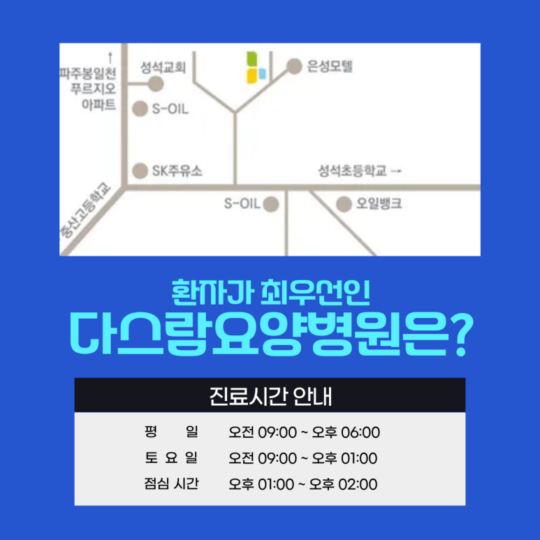 저희 다스람요양병원은 환자 한 분, 한 분의 상황을 고려한 관리로 든든한 회복 파트너가 되겠습니다.