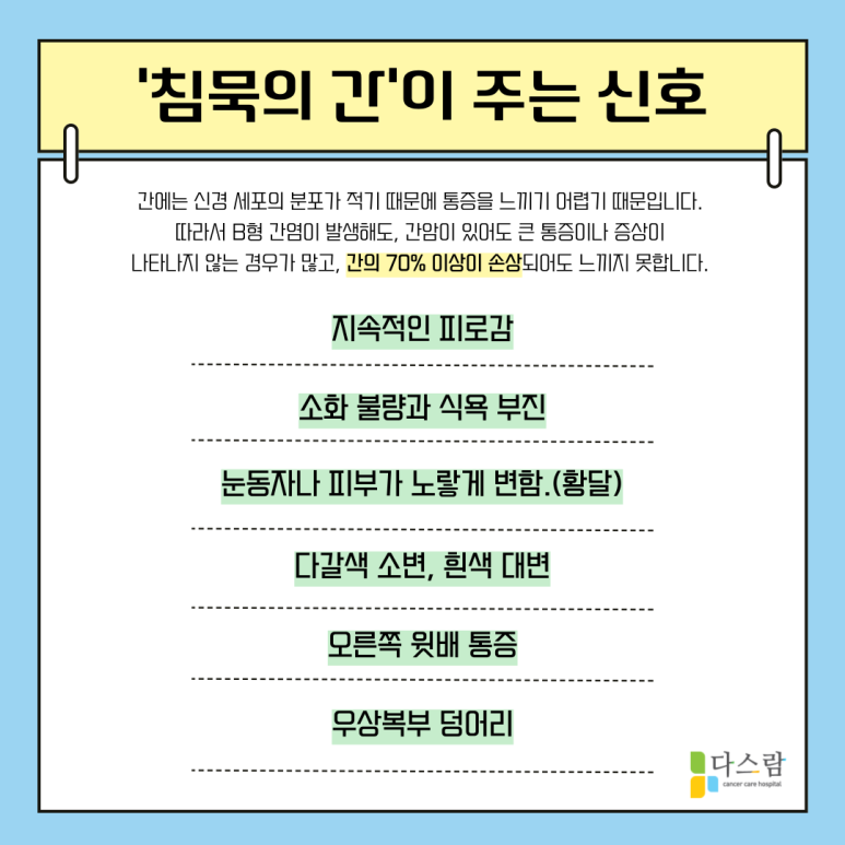 어느정도냐면 간의 70% 이상이 손상되어도 우리는 그 증상을 느끼지 못할 정도인데요. 따라서 간에서 보내는 신호를 잘 캐치할 필요가 있습니다. 지속적인 피로감이나, 소화 불량, 식욕부진 등의 증상이 원인 모르게 반복된다면, 눈동자나 피부가 노래지는 황달이나, 소변이 다갈색을 띄고, 대변이 희게 변했다면 간 기능 이상을 의심하고 병원에 내원하여 정밀한 검사를 받아 보시는 것이 바람직합니다.