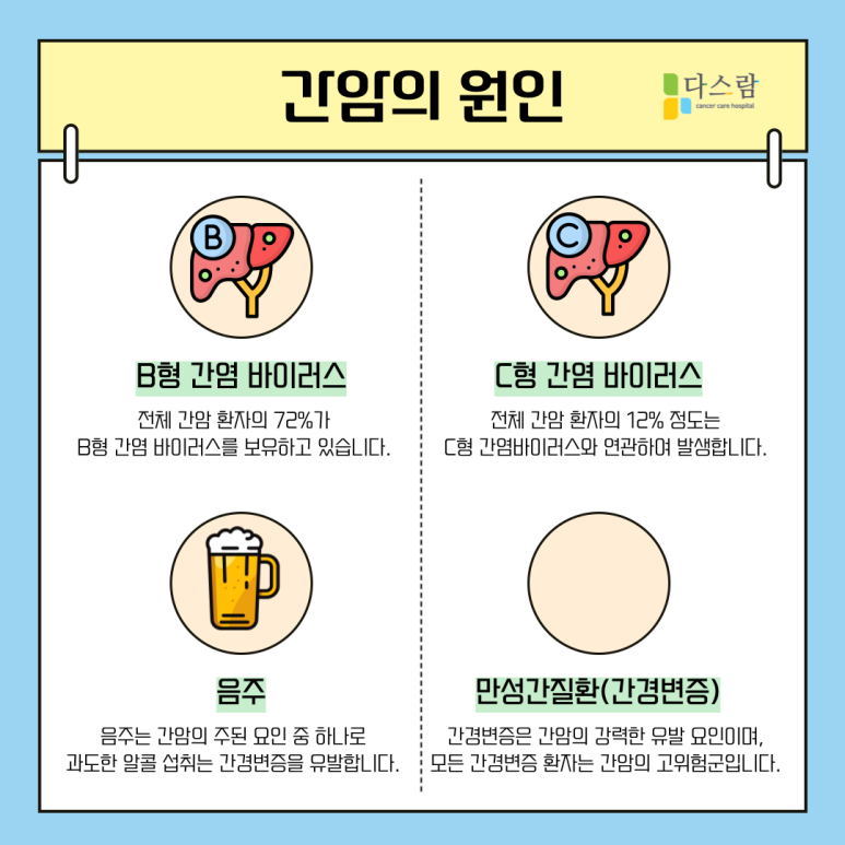 간암의 원인이라고 하면 먼저 떠오르는 것이 무엇이신가요? 아마 음주라고 생각하시는 분들이 꽤 많으실 것 같아요. 하지만 음주, 알콜은 간암에 영향을 줄 수는 있지만, 이보다 더 크게 연관되어 있는 요인이 있습니다. 바로 간 질환인데요.