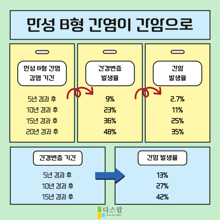 만성 B형 간염에 의해 염증이 반복되고 지속되면서 세포의 파괴와 재생이 반복되고, 이에 간이 섬유화되면서 간경변증이나 간암 등으로 발전하게 될 수 있는 것이죠.