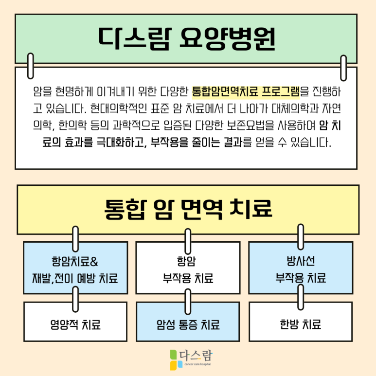 일산암요양병원 다스람병원에서는 간암을 비롯한 다양한 암을 현명하게 이겨내기 위한 다양한 통합암면역치료 프로그램을 진행하고 있습니다.