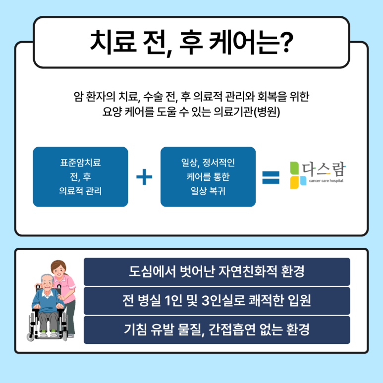 암수술 후 치료가 막막하거나, 진행하고 있는 항암치료의 부작용이 일상생활을 힘들게 한다면 편안한 마음으로 저희 다스람요양병원을 내원하여 상담받아보시기 바랍니다.