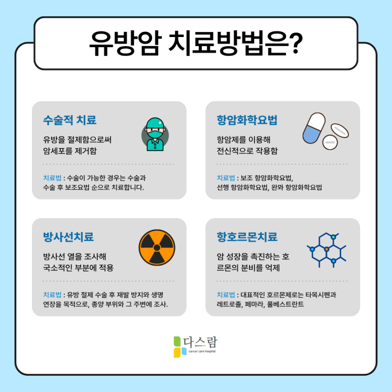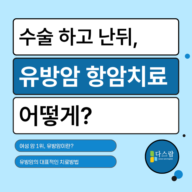유방암 수술 후에는 항암요법, 방사선요법, 표적치료 등 병행 치료가 일반적입니다.