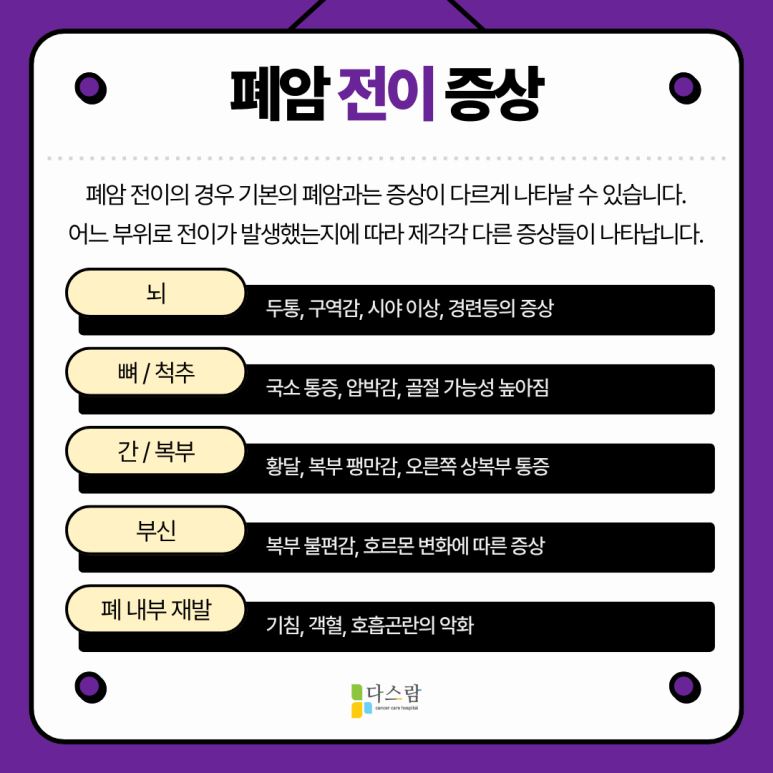 전이가 생기면 원발 폐 증상과는 다른 증상이 나타날 수 있어요. 주요 증상들을 기존의 폐암증상과 다를 수 있는데요, 뇌나 뼈, 간 등 어느 부위로 전이되었는가에 따라 제각기 다른 증상들을 보이고 있답니다.