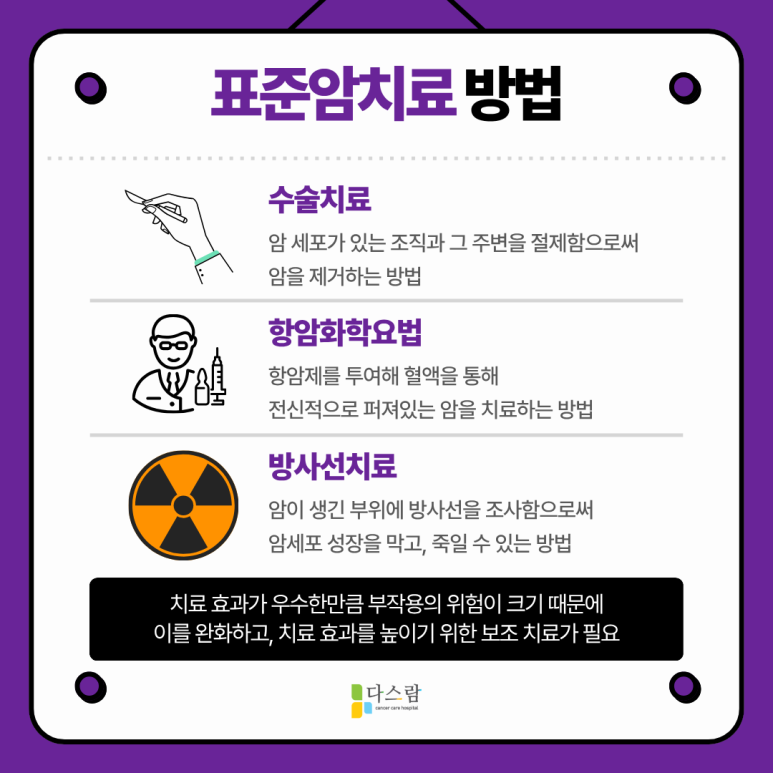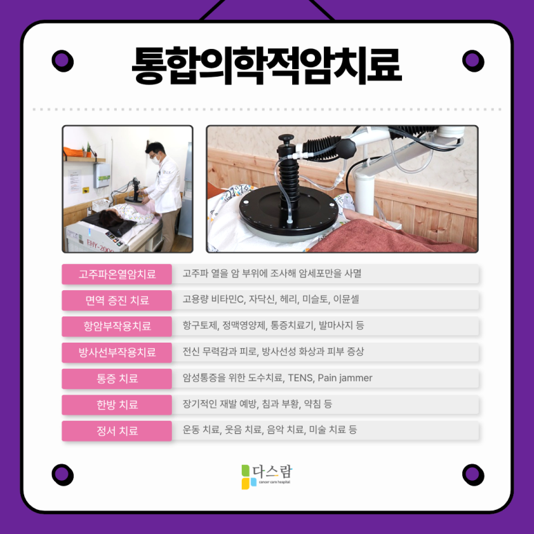 파주암요양병원을 대표하는 저희 다스람요양병원에서는 전이·재발이 확인되는 경우 다학적 접근을 통해 환자분들께서 보다 효율적으로 회복하실 수 있도록 도와드리고 있는데요. 항암치료와 더불어 과학적으로 증명된 다양한 요법들을 병행하고 있어요.
