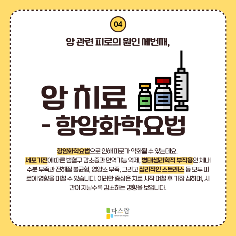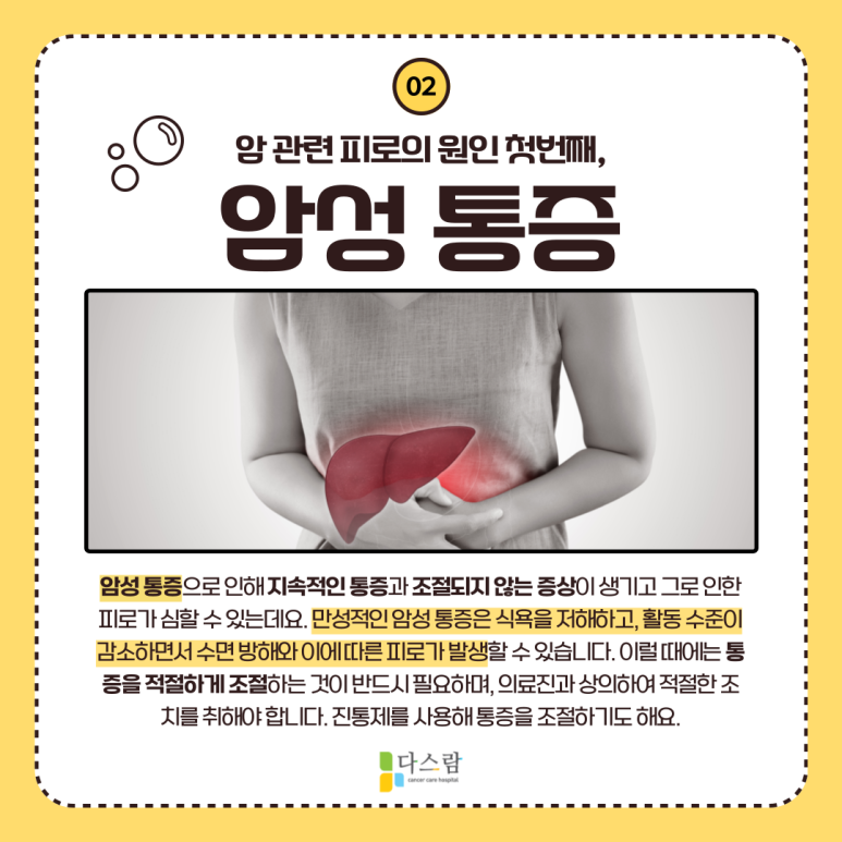 대표적인 암 치료의 후유증 중 하나에는 피로가 있습니다. 암에 의한 피로는 다양한 원인에 의해 나타날 수 있는데요.