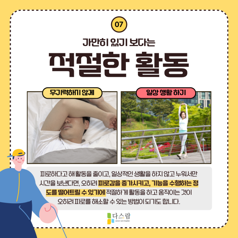 또한 피로하다고 해 활동을 줄이고, 일상적인 생활을 하지 않고 누워서만 시간을 보낸다면, 오히려 피로감을 증가시키고, 기능을 수행하는 정도를 떨어트릴 수 있기에 적절하게 활동을 하고 움직이는 것이 오히려 피로를 해소할 수 있는 방법이 되기도 합니다.