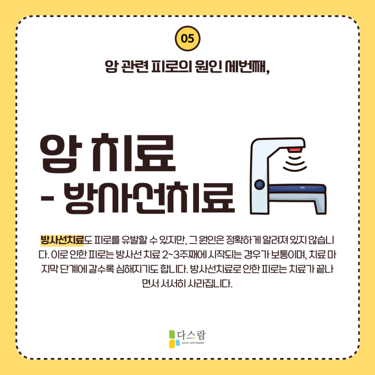 방사선치료도 피로를 유발할 수 있지만, 그 원인은 정확하게 알려져 있지 않아요. 이로 인한 피로는 방사선 치료 2~3주째에 시작되는 경우가 보통이며, 치료 마지막 단계에 갈수록 심해지기도 합니다. 이러한 피로는 방사선치료가 끝나면서 서서히 사라집니다.