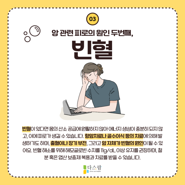 빈혈이 있다면 몸의 산소 공급에 원활하지 않아 에너지 생성이 충분히 되지 않고, 이에 피로가 생길 수 있습니다. 암 환자에게 빈혈은 흔히 나타날 수 있는 증상인데요. 항암치료나 골수이식 등의 치료에 의해 발생하기도 하며, 출혈이나 장기 부전, 그리고 암 자체가 빈혈의 원인이 될 수 있어요. 빈혈 해소를 위해 대개 헤모글로빈 수치를 11g/dL 이상 유지하는 것을 권장하며, 이를 위해 철분 혹은 엽산 보충제를 복용하거나 치료를 받을 수 있습니다.