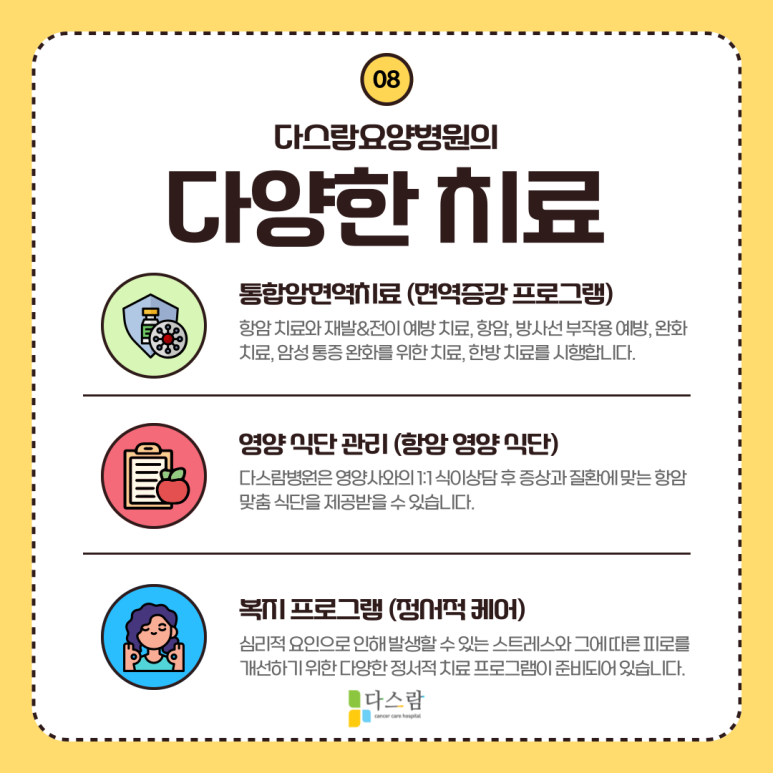 피로를 개선하기 위해서는 체력을 키워 사용할 수 있는 에너지를 늘리는 것이 필요합니다. 다스람요양병원에서는 통합암면역치료를 통해 면역력을 증강함으로써 그에 항암 효과를 올리고, 부작용과 고통을 최소화할 수 있도록 도와드립니다.