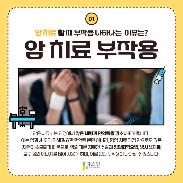 암은 치료하는 과정에서 많은 체력과 면역력을 감소시키게 됩니다. 이는 암과 싸우기 위해 필요한 면역력 뿐만 아니라, 항암 치료 과정 만으로도 많은 체력이 소모되기 때문인데요. 암의 치료 방법인 수술과 항암화학요법, 방사선치료 모두 몸의 에너지를 많이 사용케 하며, 이로 인한 부작용이 나타날 수도 있죠.