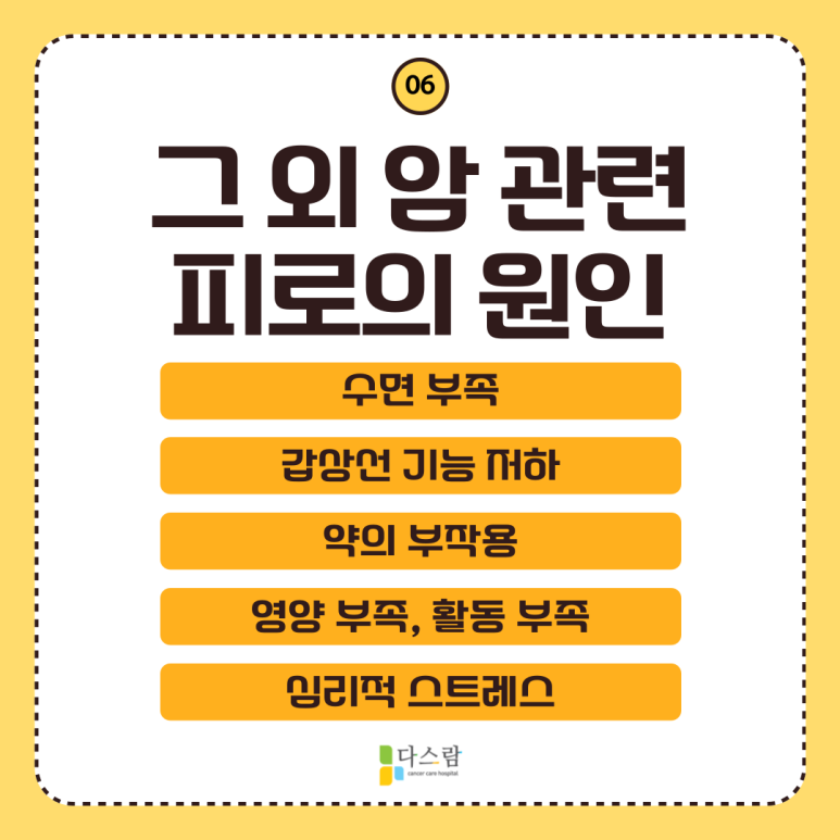 이외에도 진통제나 수면제, 항경련제와 같은 약을 복용하거나, 장기 기능 부전, 영양 결핍이나 활동 부족 등의 다양한 암과 관련된 원인이 피로를 유발할 수 있습니다. 특히나 암 환자에게는 흔하게 식욕 부진 증상이 나타날 수 있지만, 몸속에서 필요한 에너지의 양은 늘어나기 때문에 피로가 심해질 수 있는데요. 식욕부진이 심하다면 영양사와의 상담을 통한 적절한 식이요법이 필요할 수 있어요.