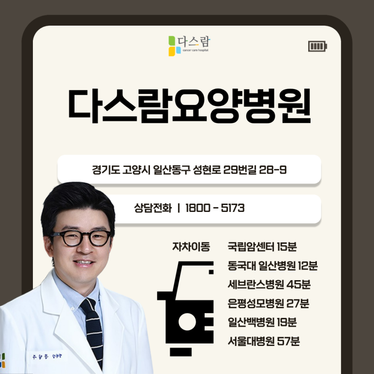 일산, 파주 지역의 암환자 요양병원으로 찾아주시는 저희 다스람요양병원은 단순한 요양 공간이 아닌, 보다 체계적인 시스템을 운영하며 환자의 전신 컨디션을 안정적으로 유지하도록 도와드리고 있는데요,