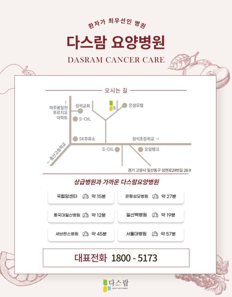 일산암재활요양병원 다스람병원에 대해 상담이 필요하시거나, 궁금한 점이 있다면 언제나 내원하여 꼼꼼한 상담 받아보시길 바랍니다.