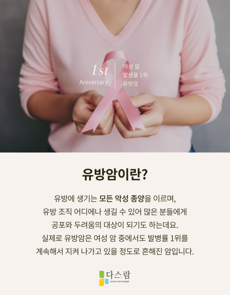 유방암은 유방에 생기는 모든 악성 종양을 이르며, 유방 조직 어디에나 생길 수 있어 많은 분들에게 공포와 두려움의 대상이 되기도 하는데요. 실제로 유방암은 여성 암 중에서도 발병률 1위를 계속해서 지켜 나가고 있을 정도로 흔해진 암이죠.