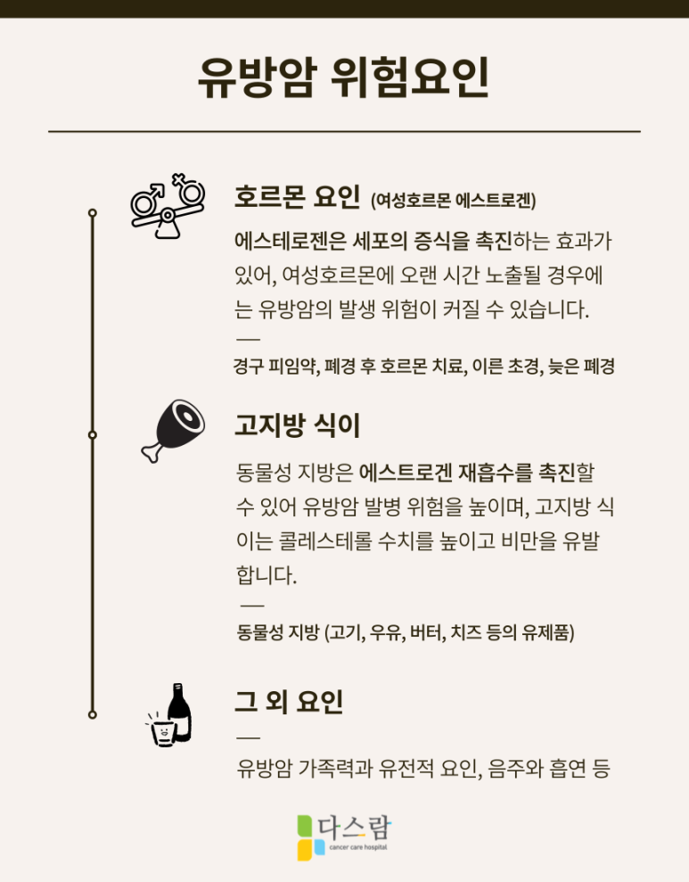따라서 여성 호르몬에 영향을 주는 경구 피임약이나, 흔히 폐경 후에 진행하는 호르몬 치료, 그리고 정상적인 생리 과정에서 작용하는 여성호르몬에 오래 노출되었을 때(초경이 이르거나, 폐경이 늦은 경우) 유방암의 발생 위험이 커집니다.