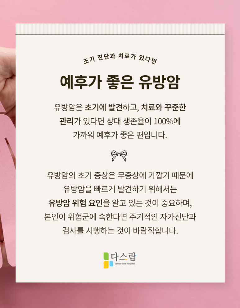 하지만 이러한 유방암은 초기에 발견하고, 치료와 꾸준한 관리가 있다면 이겨낼 수 있는 예후가 좋은 암에 속하기 때문에 암을 진단받았다고 해 낙심하기는 이르다는 것을 꼭 알아 두시기 바랍니다.