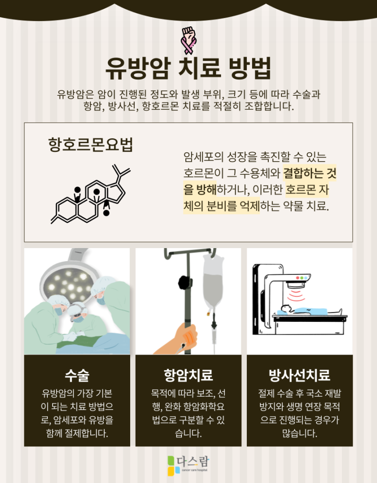항호르몬 치료는 약물 치료에 해당하며, 이 치료에는 타목시펜과 아나스트로졸, 레트로졸, 엑세메스테인과 같은 약제 등이 사용됩니다. 항 호르몬 치료 전에는 대개 수술을 통해 암 조직과 해당 유방을 제거합니다.
